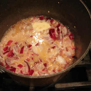 Next in a pot I started to saute red onions, minced garlic and dairy free butter. I cooked these down until nice and soft and fragrant.