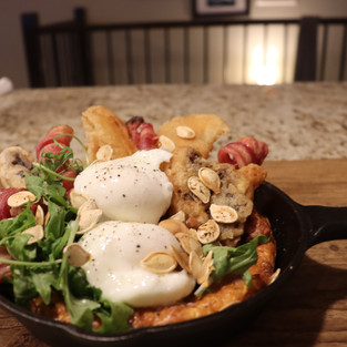 Pumpkin Hash with Tempura Pumpkin and Portabella, with Homemade Bacon, Eggs and Pumpkin Seed